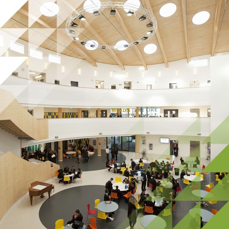 The building's timber frame will save 3,000 tonnes of carbon dioxide, compared to traditional concrete or steel structures, and for every three trees used in the building, four will be planted. The curved plan of the main building was considered as a series of concentric bands. The outer perimeter houses the main teaching and learning accommodation to maximise the potential for natural daylight, views and ventilation; while the inner band provides the main circulation route, stacked as a series of open balconies that wrap around the central Open Forum.